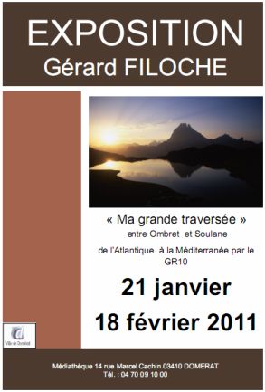 Soit une traversée d'Ouest en Est durant 60 jours. C'est au travers de l'ensemble de ces photos, paysages ou gens bouleversant, que l'auteur raconte son cheminement au coeur des Pyrénées qui lui sont si chères. A cela, il rajoute un autre chemin, plus intérieur celui-ci, et grâce aux mots qu'il pose sur les images. Gérard Filoche précise que « l'exposition est un instantané des 60 jours de notre traversée, car chaque jour à son histoire, comme chaque photo à la sienne ». Car au cours de 900 kilomètres parcourus, on est certain de rencontrer de belles anecdotes ! La Médiathèque de Domérat accueille ainsi l'ensemble des photos prises par l'auteur, mais également quelques pastels et aquarelles comme des carnets de voyage. Gérard Filoche enrichi son propos de différents objets rapportés de cette longue traversée. Passionné par ce territoire profondément rude et attachant, Gérard Filoche pose son sac à Domérat jusqu'au 18 février." | ||